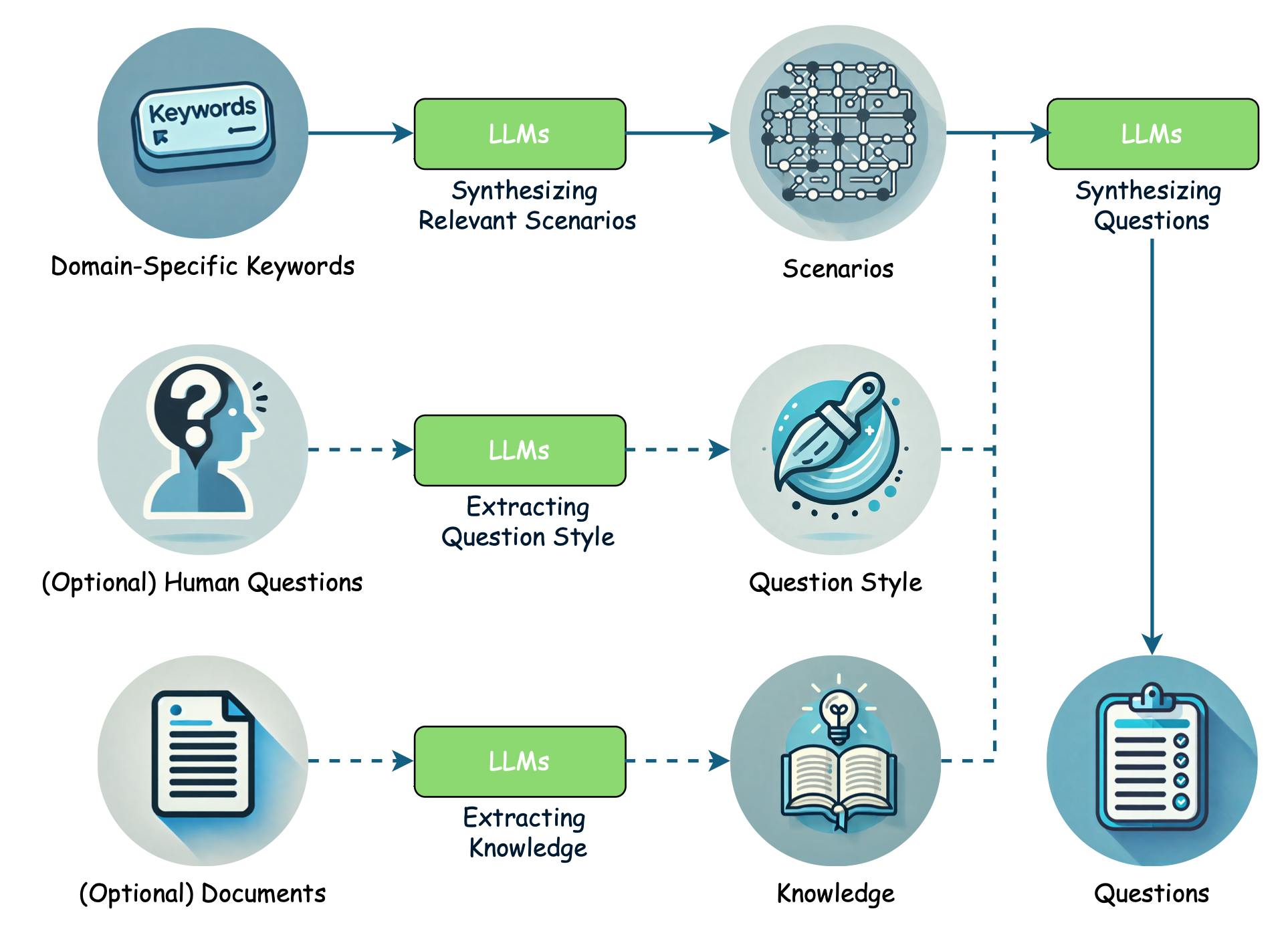 Figure 1: Question generation pipeline. LLMs synthesized real-world scenarios from domain keywords, references, and sample human queries to produce 56,257 realistic training questions.