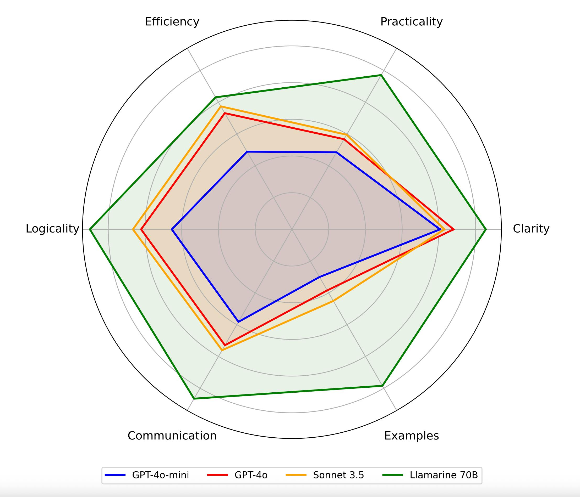 Figure 3: Comparison of Llamarine over commercial models. Llamarine (green) surpasses GPT-4o, Sonnet 3.5, and GPT-4o-mini across all dimensions, particularly excelling in Practicality and Expert Communication.