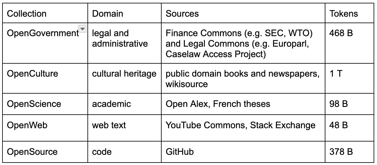 The resulting dataset is unlike other open datasets, which are composed in large part of web data. Common Corpus is composed of books, newspapers, scientific articles, government and legal documents, code, and more. This can help develop models which have generalizable capabilities for a wide variety of tasks. For example, the inclusion of scientific and legal documents is intended to increase world knowledge of LLMs trained on this corpus and increase factual outputs. Code data can be used not only to train code-generation models, but has been shown to improve reasoning capabilities for natural language generation.